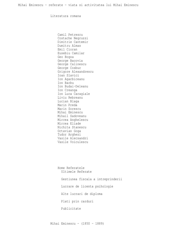 Mihai Eminescu Referate Viata Si Activitatea Lui Mihai Eminescu