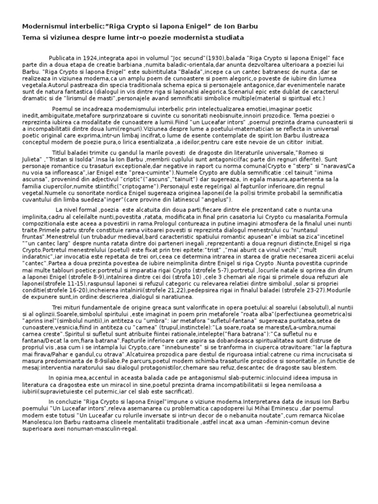 Tema Si Viziunea Despre Lume Text Poetic I Barbu Riga Lapona